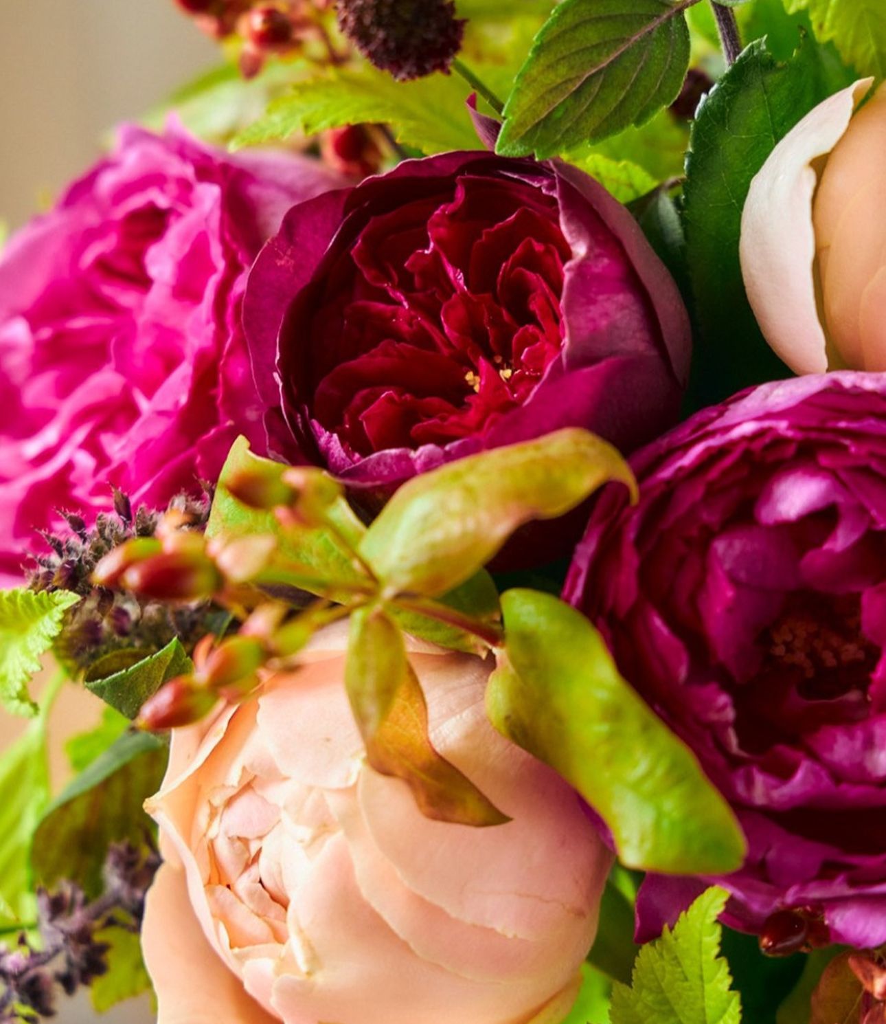 枝ものの曲線や動きがつくる余白は、秋バラの美しさをより引き立て、